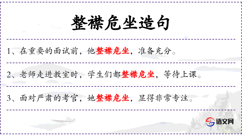 - 整襟危坐:这个成语源自古代礼仪,强调坐姿端正,表现出严肃认真的态度。