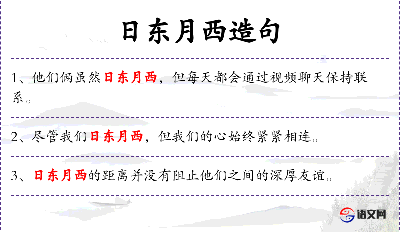 - 日东月西:这是一个成语,比喻相隔很远。