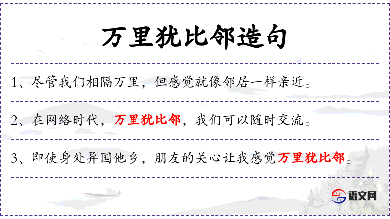 - 万里犹比邻:成语,意思是即使相隔万里,也感觉像邻居一样近。