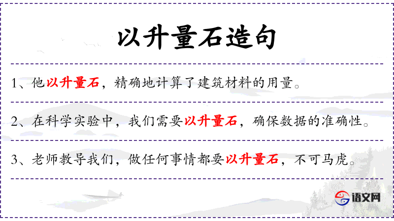 1. 【以升量石】 升、石:容量单位,十升为一斗,十斗为一石。比喻以肤浅的理解力推测深奥的道理。