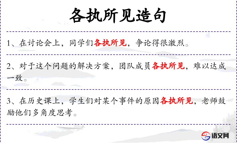 1. 【各执所见】 执:坚持。各自坚持自己的观点和意见。