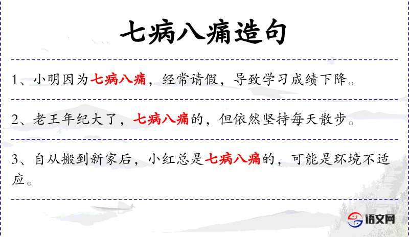 - 七病八痛:形容身体多病,常用来形容老年人身体状况不佳。