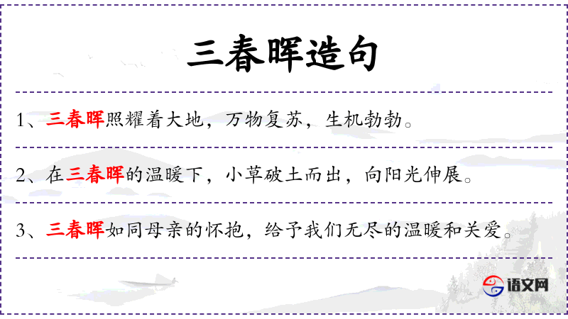 1. 【三春晖】 - 春天的阳光。喻母爱; 比喻深厚的恩情。