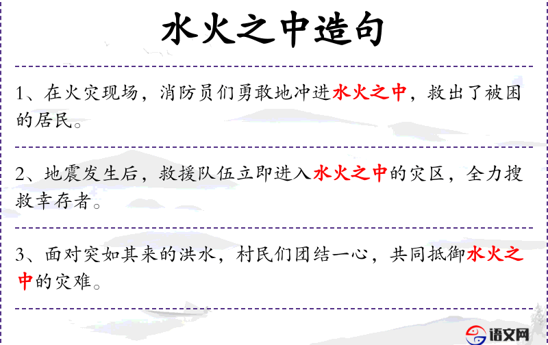 1. 【水火之中】 - 水火:比喻灾难。灾难困苦之中。