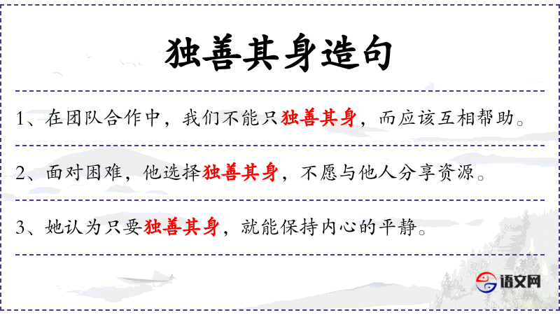 1. 【独善其身】 独:唯独;善:好,维护。原意是做不上官就修养好自身。现指只顾自己,不管别人。
