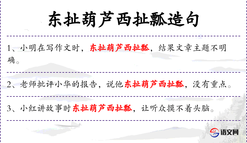 - 东扯葫芦西扯瓢:成语,比喻说话或写文章东拉西扯,没有中心。
