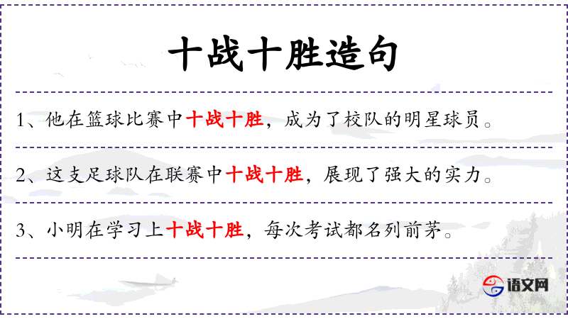 - 十战十胜:表示连续十场比赛都取得了胜利,强调了胜利的连续性和完美性。