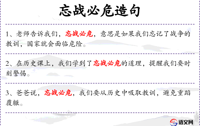 - 老师在讨论国家安全时,通过引用“忘战必危”这一成语,强调了准备工作的至关重要性。