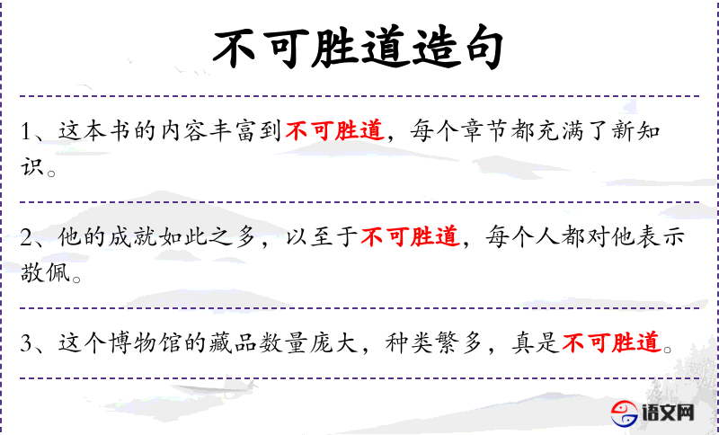- 不可胜道:形容内容太多,无法一一列举,相关词汇有“不胜枚举”、“数不胜数”。