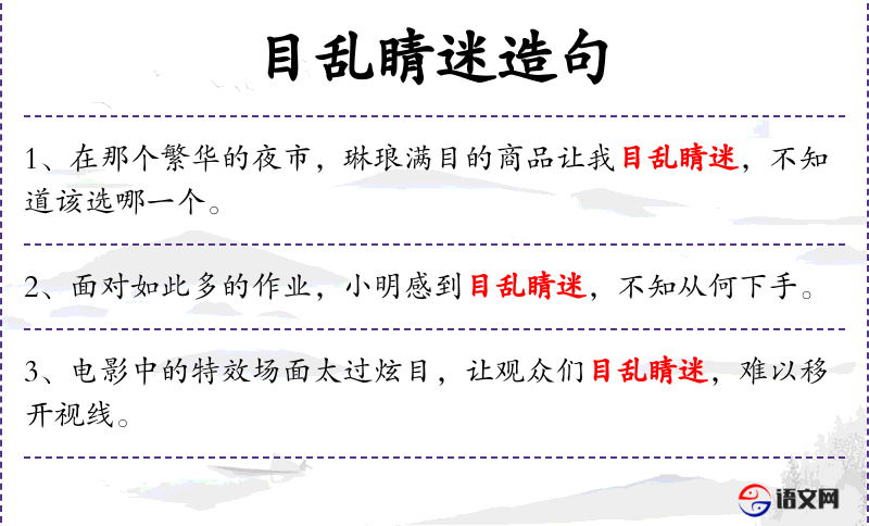 1. 【目乱睛迷】 - 形容所见情景复杂纷繁或怪异多变,令人惊异。同“目乱精迷”。