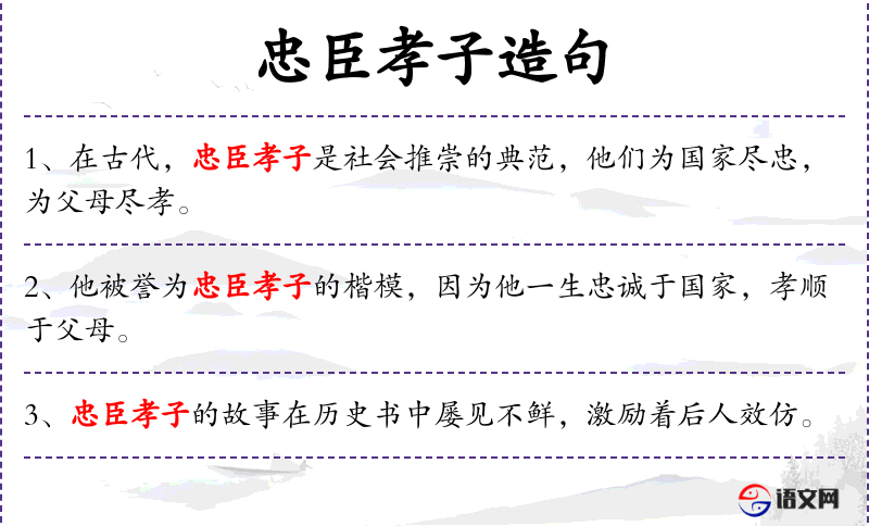 - 忠臣孝子:名词短语,指忠诚的臣子和孝顺的儿子,是**传统文化中的美德。