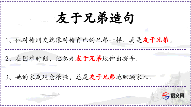 - 成语:“友于兄弟”是一个常用的成语,源自《左传·僖公二十五年》:“友于兄弟,施于有政。”意为对待朋友如同对待自己的兄弟,并将其推广到政治行为中。