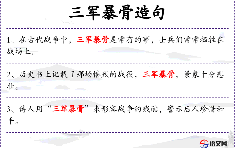 三军:指所有军队;暴:晒。三军的尸骨暴露于战场。形容战败,使军士尸横战场。