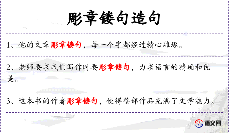 - 彫章镂句:形容词,意为精心雕琢的文字,通常用来形容文章或演讲稿的语言非常优美、精炼。