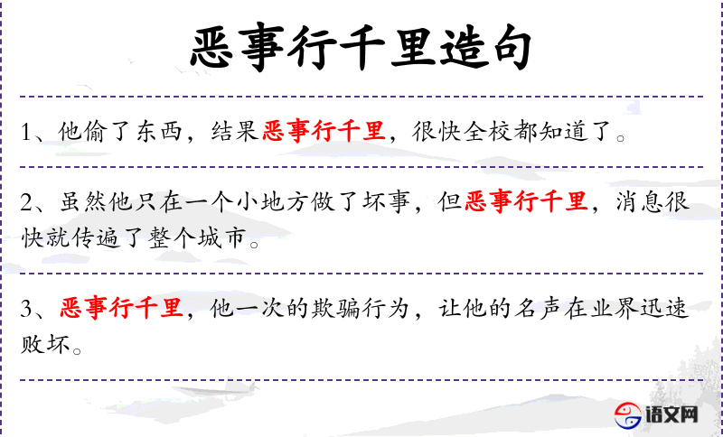 2. 【恶事行千里】 指好事不容易被人知道,坏事却传播得极快(含有劝告的意思)。