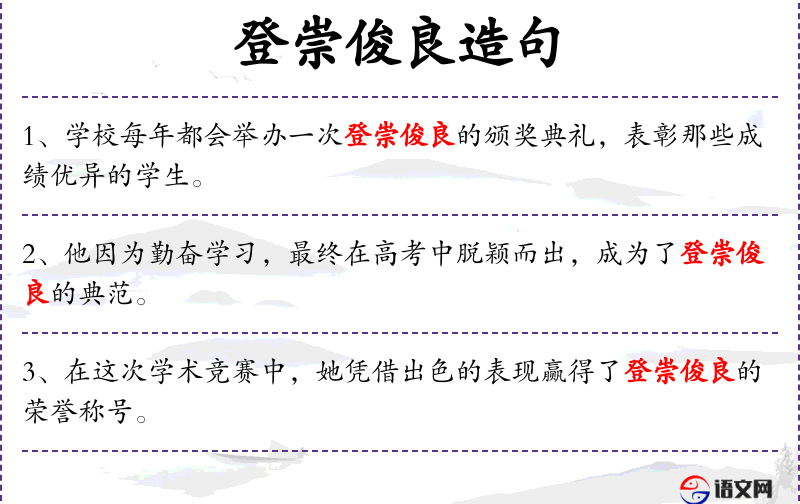 1. 【登崇俊良】 - 登:举荐,推举;崇:尊崇,尊重;俊良:才智优秀的人。推举尊重有才识的人。