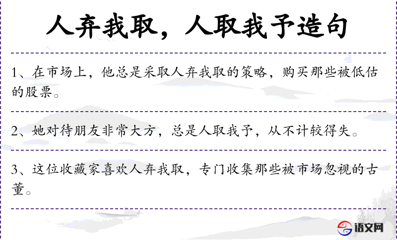 - 人弃我取:成语,意思是别人不要的我来取,表示采取与众不同的策略。