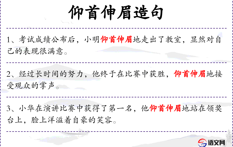 句子:“小张在书法比赛中荣获一等奖,他仰首伸眉地展示自己的作品。”
