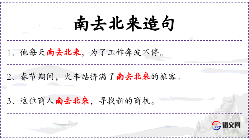 - 南去北来的:形容旅客来自不同方向,南来北往。
