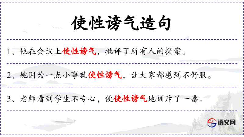 - 使性谤气:表现出任性、不理智的行为,通常带有负面情绪。