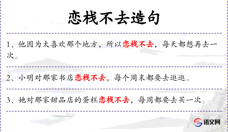 - 恋栈不去:成语,形容对某个地方或事物非常留恋,不愿离开。 *. 每次:副词,表示每一次。