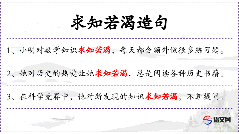 2. 【求知若渴】 - 知:知识。探求知识像口渴想喝水一样迫切。形容求知愿望十分迫切。
