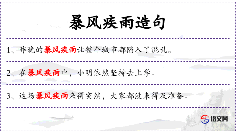 1. 【暴风疾雨】 - 指来势急遽而猛烈的风雨。