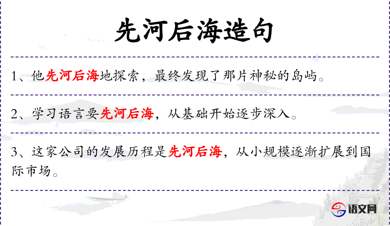 - 先河后海:比喻先做简单或熟悉的事情,再做复杂或不熟悉的事情。