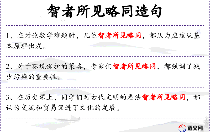3. 【智者所见略同】 - 所见:所见到的,指见解;略:大略,大致。聪明人的见解基本相同。这是对意见相同的双方表示赞美的话。