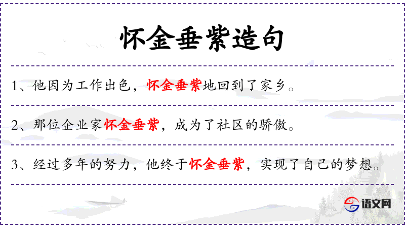 - 怀金垂紫:源自**古代对贵族服饰的描述,金和紫分别代表财富和尊贵。