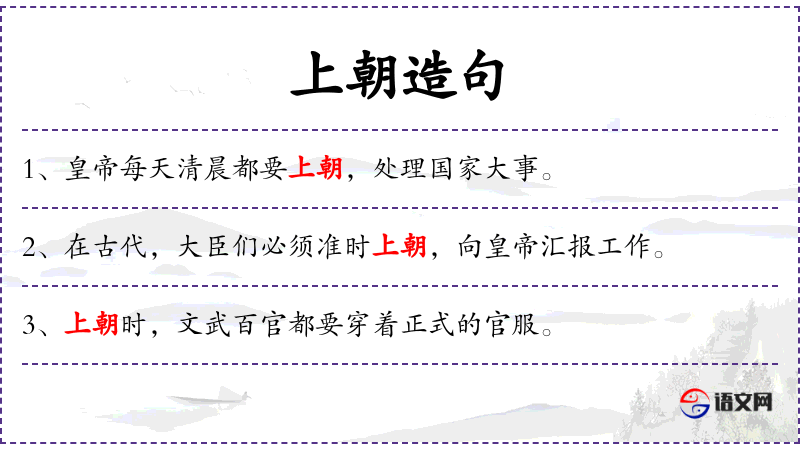 1. 【上朝】 - 臣子到朝廷觐见君王,奏事议政; 君王到朝廷上处理政务。