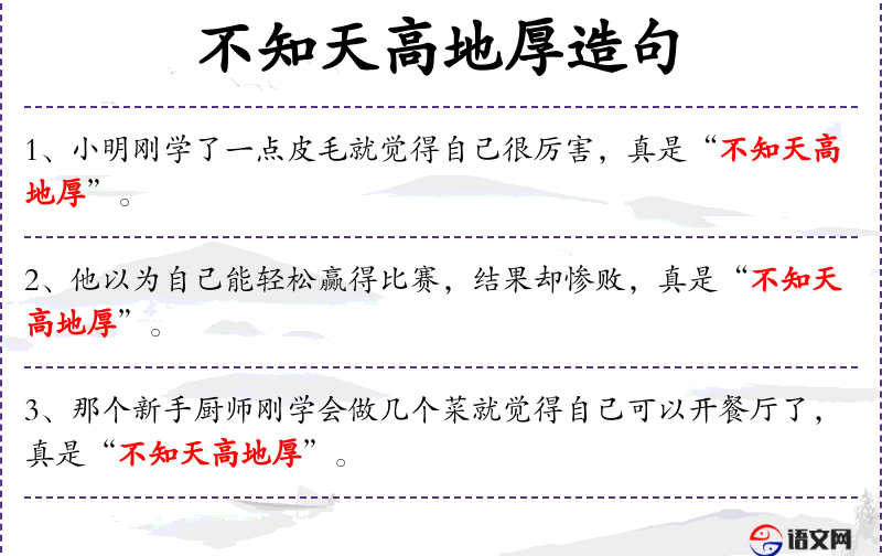 成语:“不知天高地厚”源自传统文化,用来形容人缺乏自知之明,自不量力。这个成语在社会中广泛使用,用来批评那些行为不当或过于自信的人。