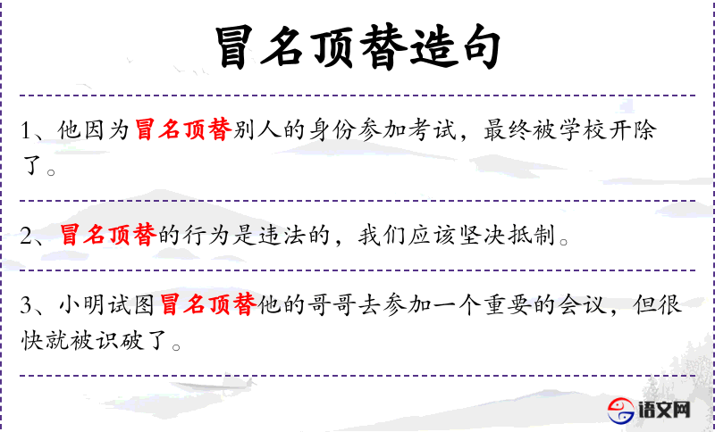 - 冒名顶替:动词短语,指使用别人的身份或名字进行欺骗。