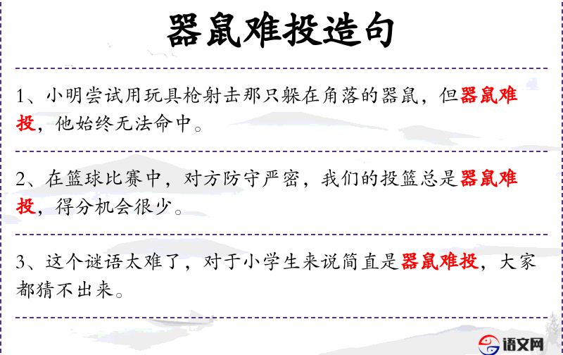 - 器鼠难投:这是一个比喻,形容投篮非常困难,如同捕捉机警的老鼠一样不易。