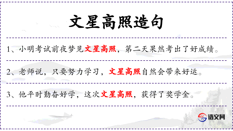 - 文星高照:这个成语源自**传统文化,文星指的是文昌星,古人认为文昌星主管文运,高照则意味着文运亨通。