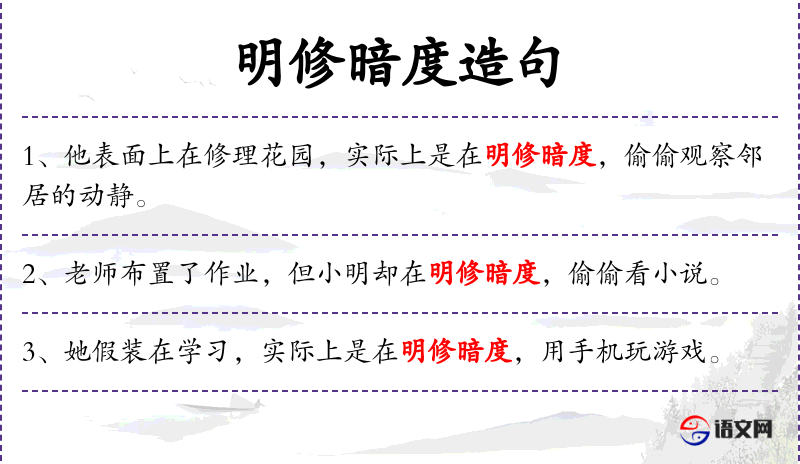 - 明修暗度:这个成语源自古代,反映了人对于表面与实际行为之间差异的认知。