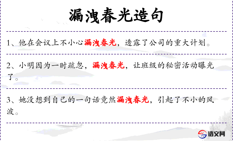 2. 【漏洩春光】 - ①透露春天的信息。②指密传消息或泄露男女私情。