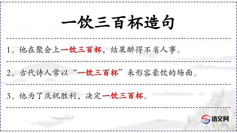 1. 【一饮三百杯】 - 《世说新语.文学》"郑玄在马融门下"刘孝标注引《郑玄别传》"袁绍辟玄,及去,饯之城东。欲玄必醉,会者三百余人,皆离席奉觞,自旦及莫,度玄饮三百余杯,而温克之容,终日无怠。"后谓痛饮为一饮三百杯。