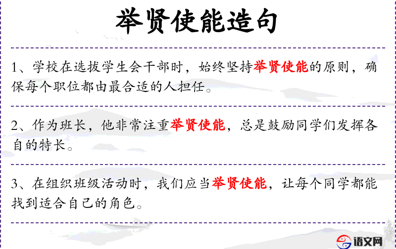 - 举贤使能:意为选拔和使用有能力的人才。