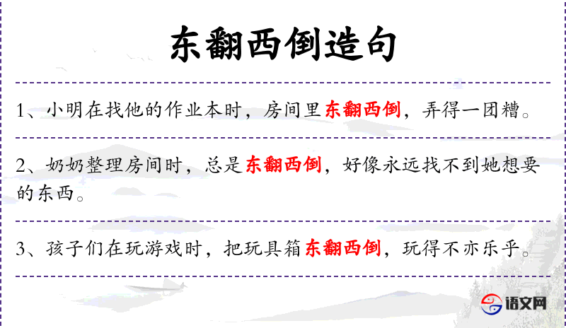 - 东翻西倒:成语,形容翻找东西的样子。