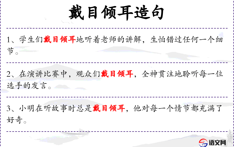 - 戴目倾耳:这是一个成语,意思是专心致志地听,形容非常专注地听取。