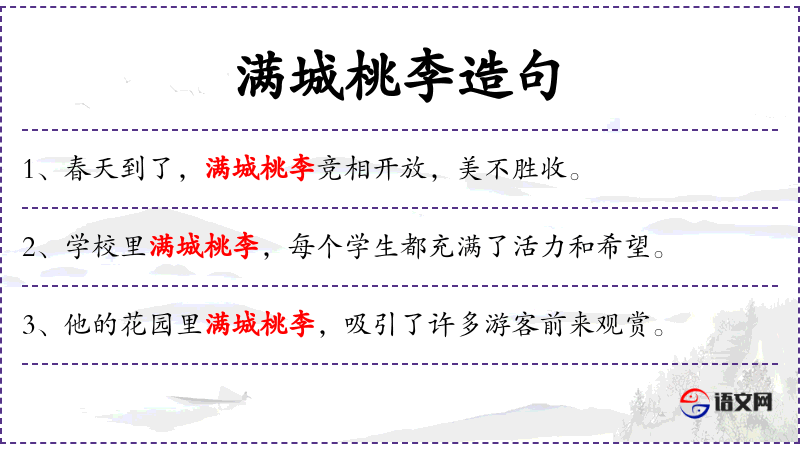 3. 【满城桃李】 - 桃李:比喻学生。城中到处都有自己的学生。比喻学生很多。