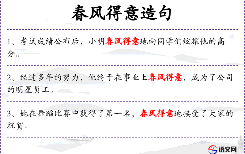 - 春风得意:成语,形容人因为成功而心情愉快、得意洋洋。