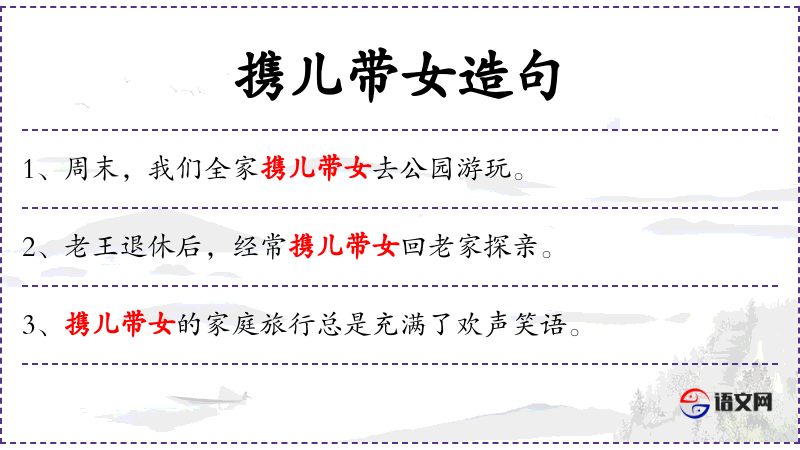 - 携儿带女:指父母带着孩子一起做某事。