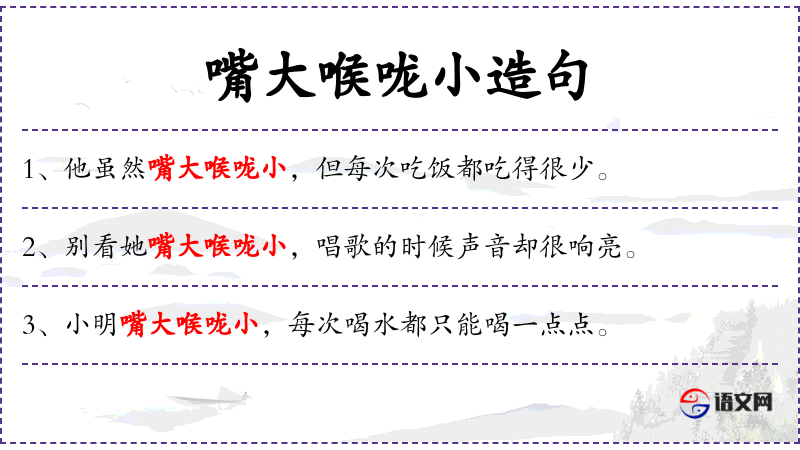 - 嘴大喉咙小:形容词短语,字面意思是嘴巴大而喉咙小,这里可能是一种比喻,表示说话声音不大但内容丰富。