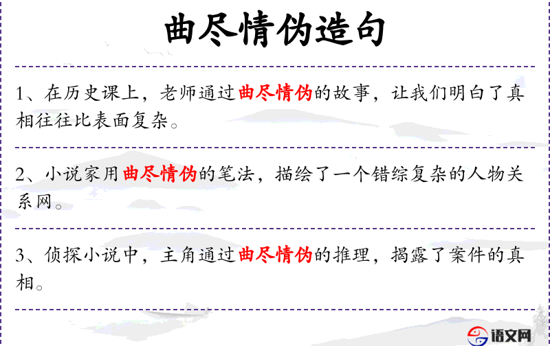 4. 【曲尽情伪】 - 曲:细致;情伪:真假。比喻细致地搞清楚事情的真假。