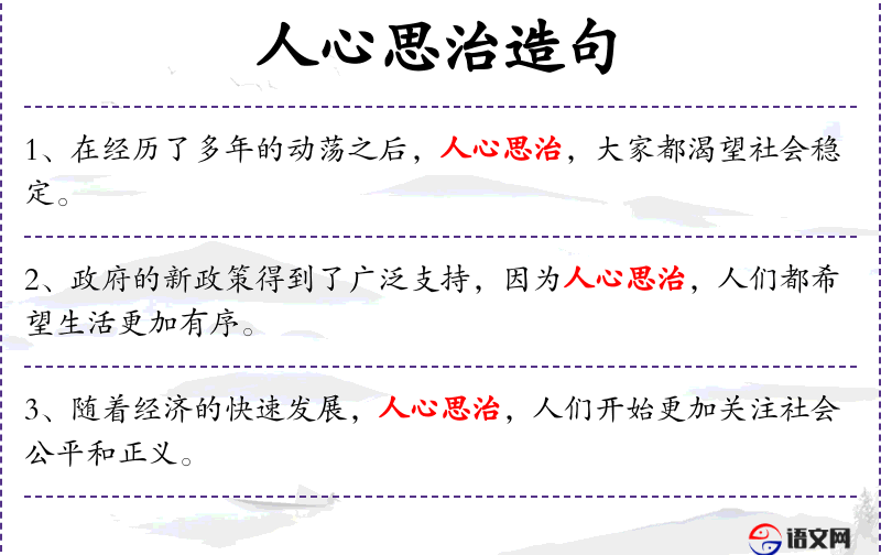 1. 【人心思治】 心:指愿望;治:社会局势安定,得到治理。民众都希望国家安定。