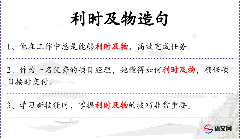 - 利时及物:成语,意为利用时间,抓住事物,形容做事迅速、有效率。