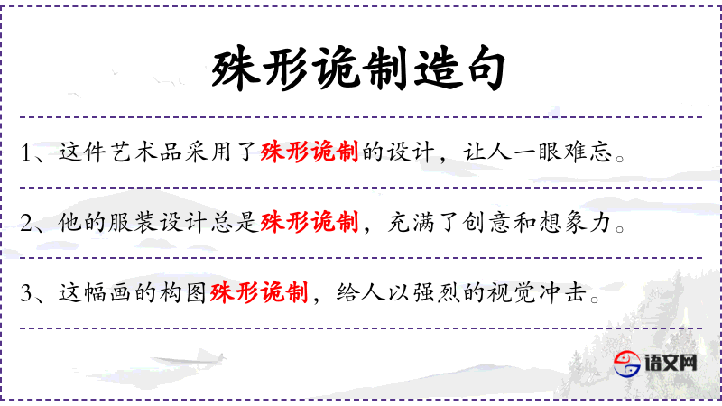 4. 【殊形诡制】 - 诡:怪异。原指宫室建筑形制多样,独特新奇。后泛指器物奇形怪状,争异斗艳。