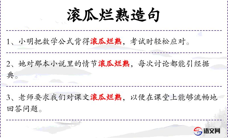 4. 【滚瓜烂熟】 - 象从瓜蔓上掉下来的瓜那样熟。形容读书或背书流利纯熟。
